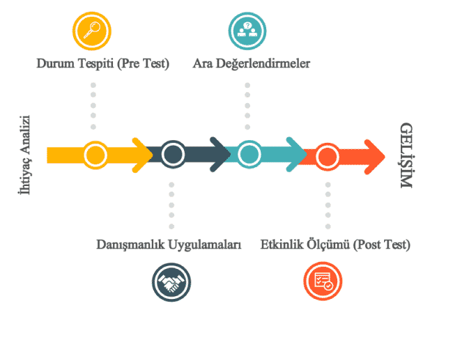 İhtiyaç analiziyle birlikte kuruma en fazla fayda sağlayacak danışmanlık uygulamaları bu süreçte gerçekleştirilir. Eğitim, gelişim programı gibi uygulamalarla danışmalık sürecinde ne derece yol katedildiğini, bu yolun nasıl iyileştirilebilirliğini anlamak için ara değerlendirmelerle danışmanlık süreci beslenir. Danışmanlık sürecinin başında, henüz uygulamalar gerçekleştirilmeden mevcut durum tespiti ile süreç sonunda ulaşılan durum arasındaki fark ölçülerek sağlanan hizmetin ne derece etkili olduğu anlaşılır ve bu yolda stratejiler belirlenir. Söz konusu danışmanlık sürecimizin aşamaları özetle aşağıdaki gibi belirlenmiştir.